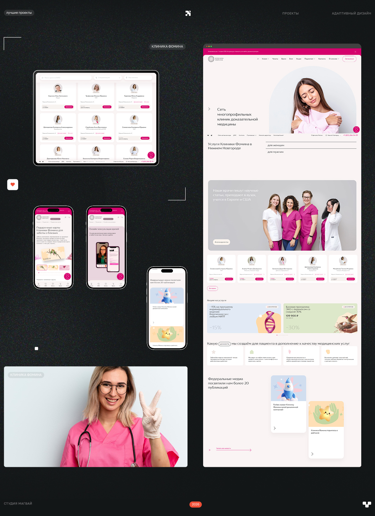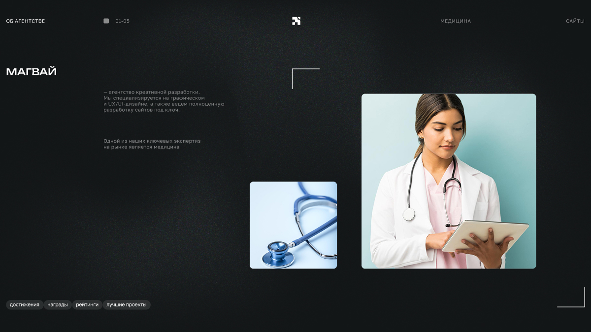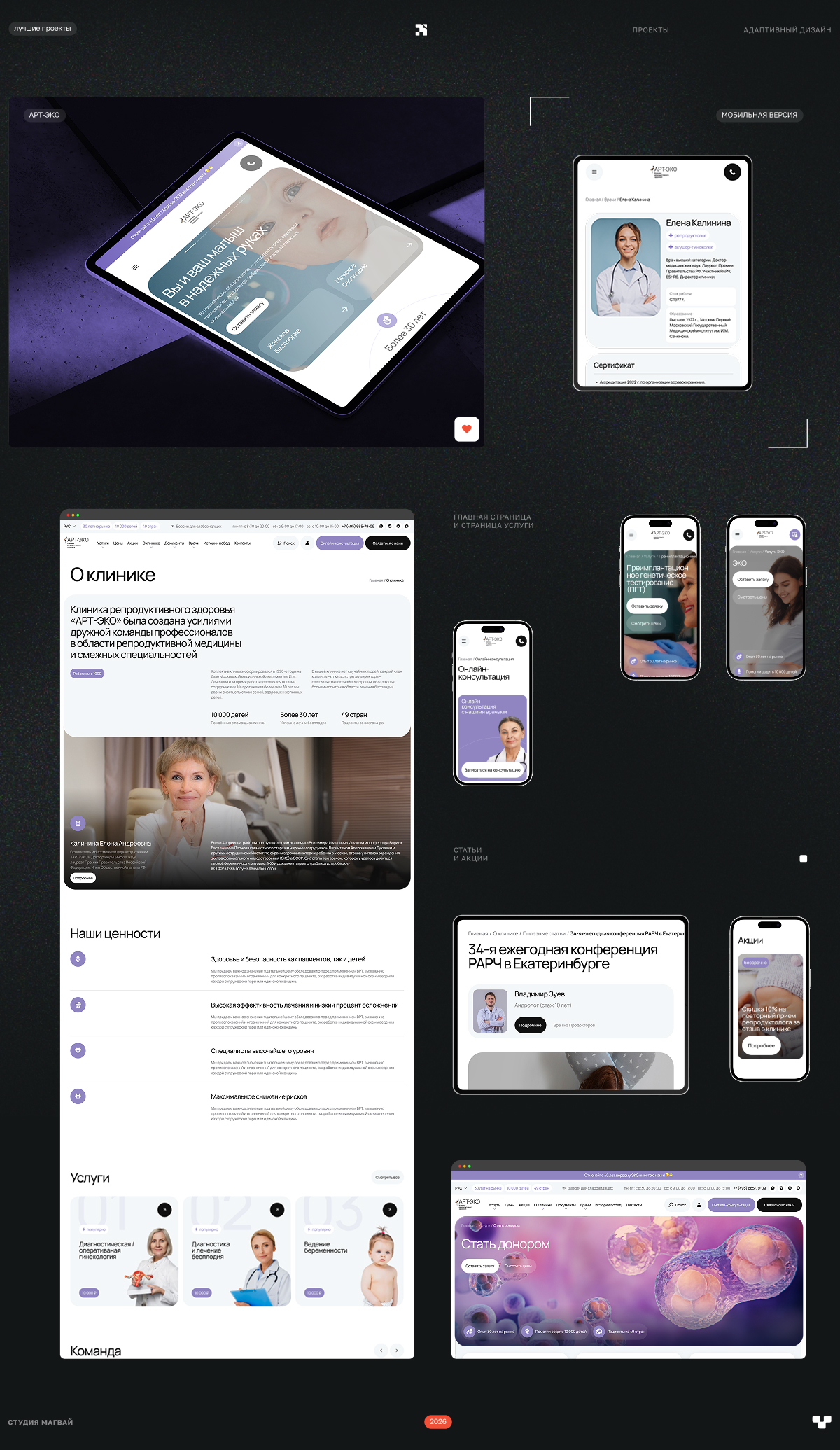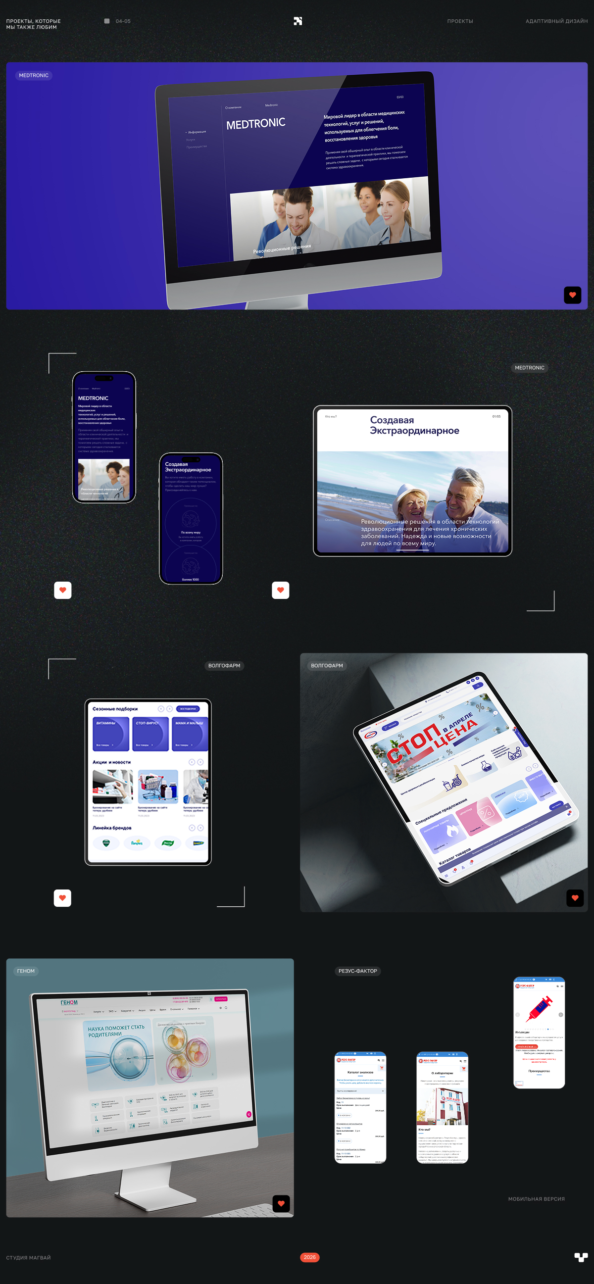 Мы специализируемся на графическом и UX/UI-дизайне, а также создаем сайты под ключ: от идеи и пользовательского сценария до полноценной технической реализации. Одно из наших ключевых направлений — медицина.