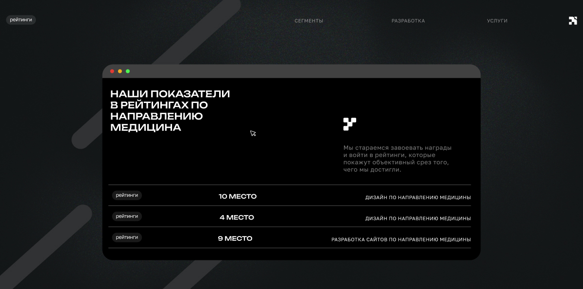 Медицина — одно из наших приоритетных направлений, поэтому мы системно инвестируем не только в качество проектов, но и в их профессиональную дистрибуцию: подаем кейсы на конкурсы, участвуем в рейтингах и стремимся получать внешнюю оценку как объективное подтверждение нашей экспертизы.