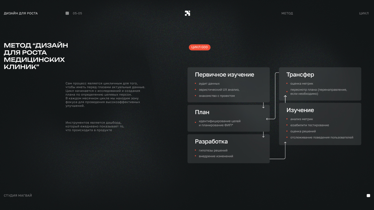 Сильная сторона Магвай — умение создавать визуально впечатляющие продукты с помощью актуального дизайна, сторителлинга и тонкой настройки пользовательского опыта. Поэтому, помимо соблюдения процессов, требований и отраслевых стандартов, мы умеем работать с тем, что в медицинской коммуникации зачастую становится решающим фактором, — с человеческим восприятием.
