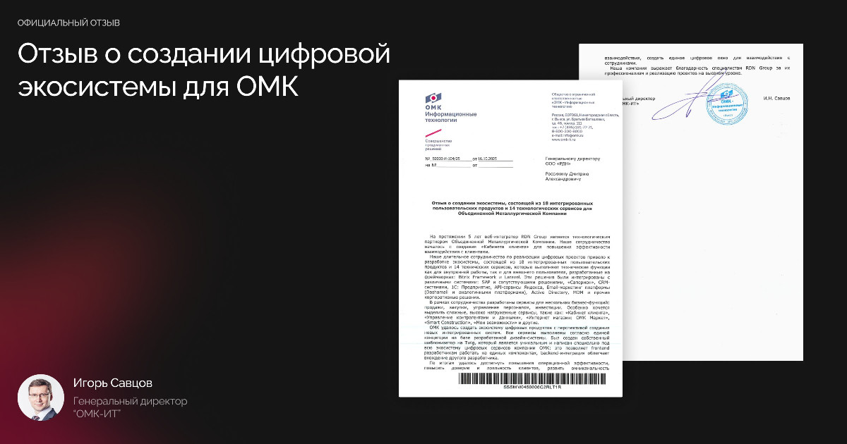 Компании удалось реализовать инновационную организационную модель управления, эффективного партнерства ОМК и RDN Group. А технологическая платформа позволяет быстро проверять гипотезы, разрабатывать новые сервисы, масштабировать текущие.