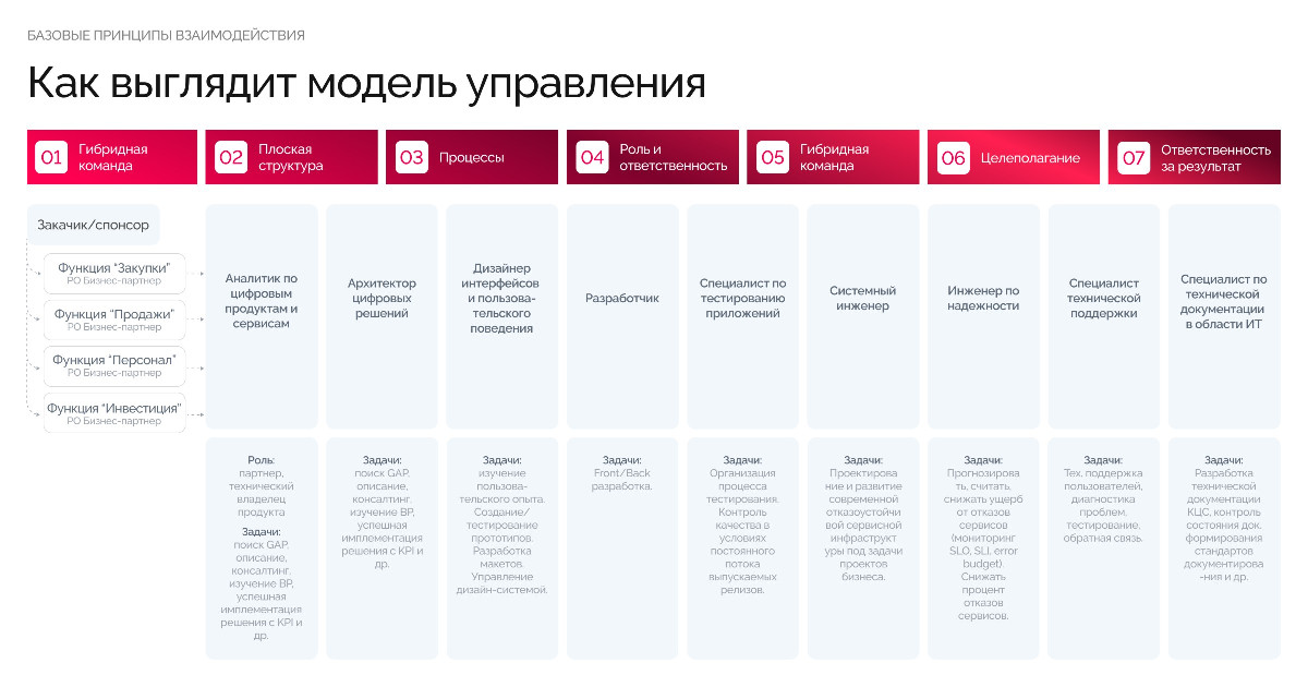 - Цель команды не разработка продукта, а полная или частичная трансформация, или автоматизация бизнес-процесса. Формируется карта ценности. Таким образом, еще на этапе MVP формулируются бизнес-метрики. И именно эти метрики являются целью команды, а не функционал. А оценка результатов осуществляется на основании эффектов.