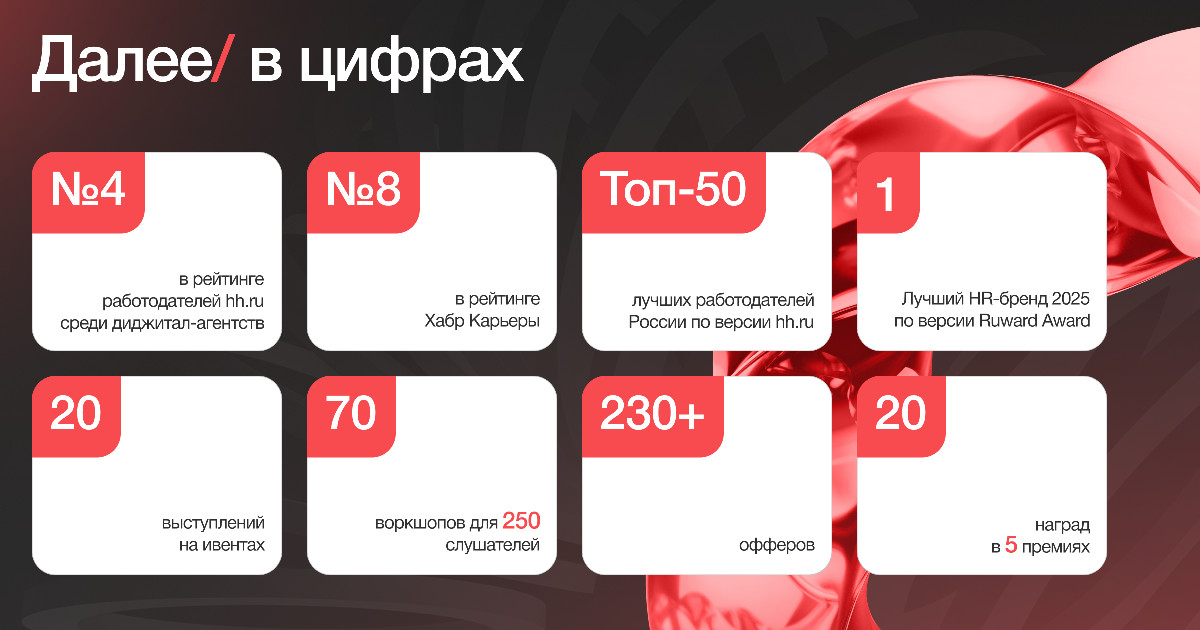 Уже несколько лет крупнейшие порталы для рекрутинга hh.ru и Хабр Карьера включают Далее в списки лучших работодателей. В 2025 году мы заняли четвертую строчку в рейтинге hh.ru и восьмую на Хабр Карьере, а еще вошли в топ 50 среди всех российских компаний. Мы обогнали крупнейших российских конкурентов по условиям труда, HR-процессам и популярности среди соискателей.