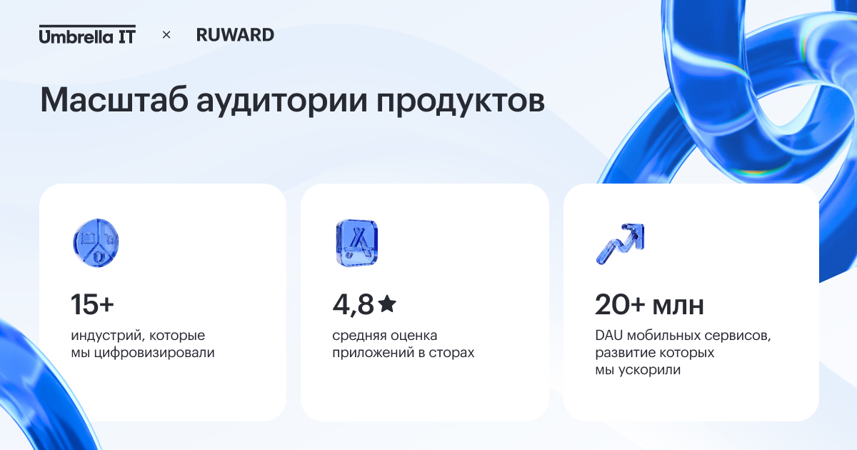 Мы в Umbrella IT разрабатываем цифровые продукты и мобильные платформы для крупного бизнеса. За более чем 16 лет работы мы реализовали свыше 400 проектов, из которых 40% мобильных приложений и сервисов для компаний из ритейла, финтеха, логистики, страхования и других отраслей.