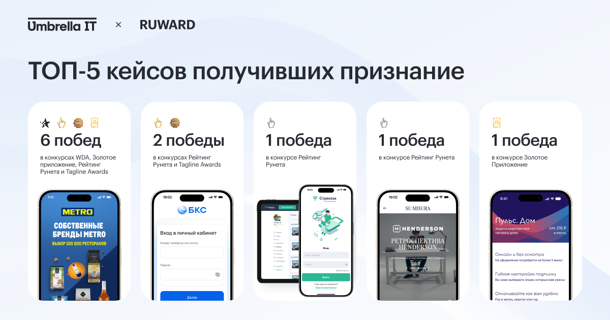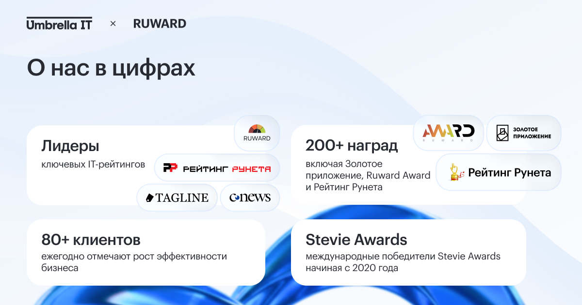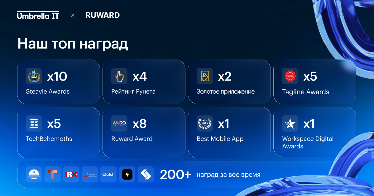 Наши проекты регулярно получают отраслевое признание: решения Umbrella IT отмечаются наградами российских и международных премий, а сама компания занимает позиции в ключевых рейтингах digital-рынка: