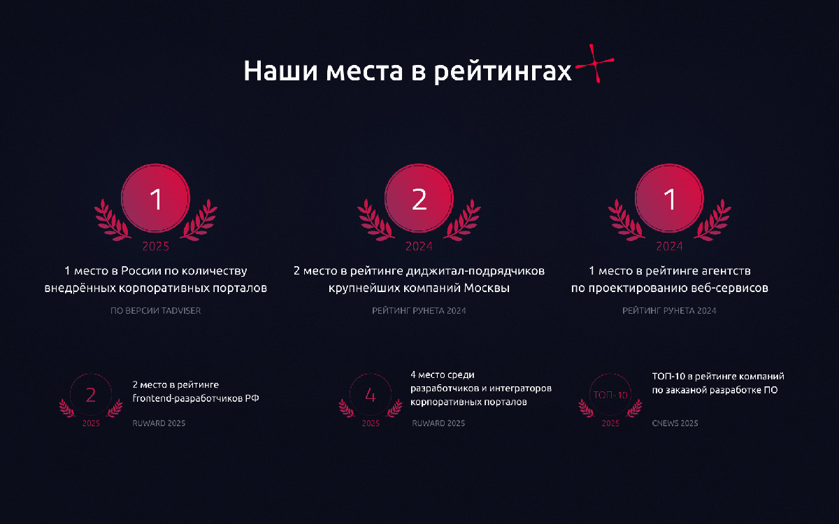 - Вершины Ruward 2025: 2-е место в Frontend-разработке, 4-е место в цифровой трансформации и разработке порталов.