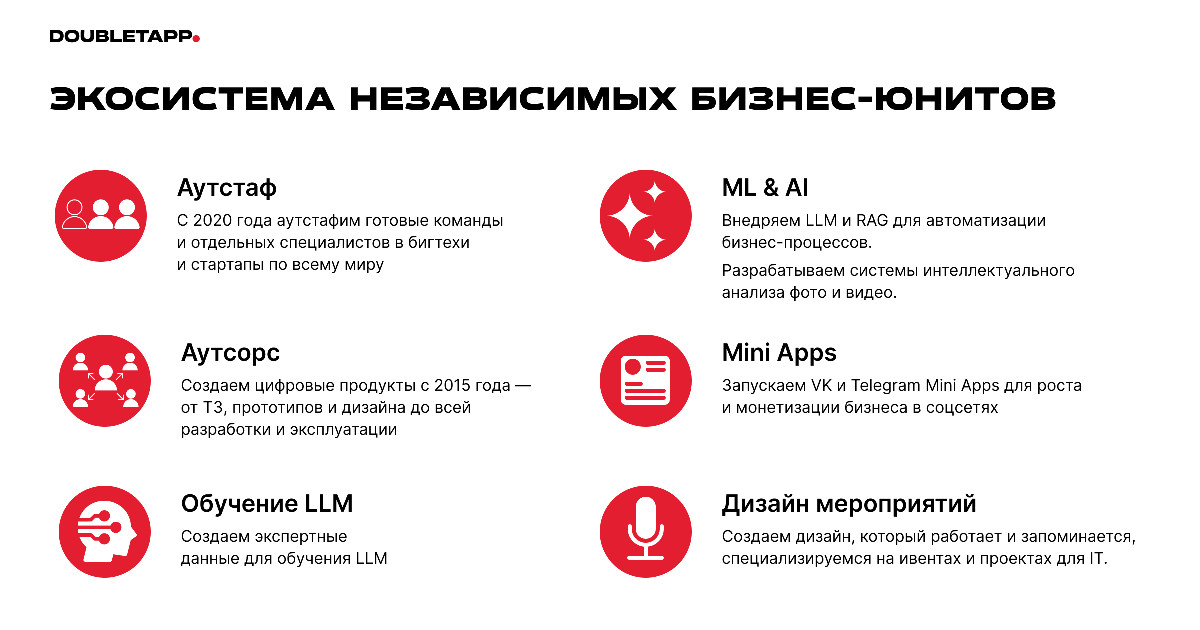В 2024–2026 Doubletapp закрепился как технологический партнёр полного цикла: усилил позиции в AI, расширил аутстаф и выстроил гибкую юнит-структуру, которая позволяет быстро заходить в новые рыночные ниши и расти вместе с клиентами.