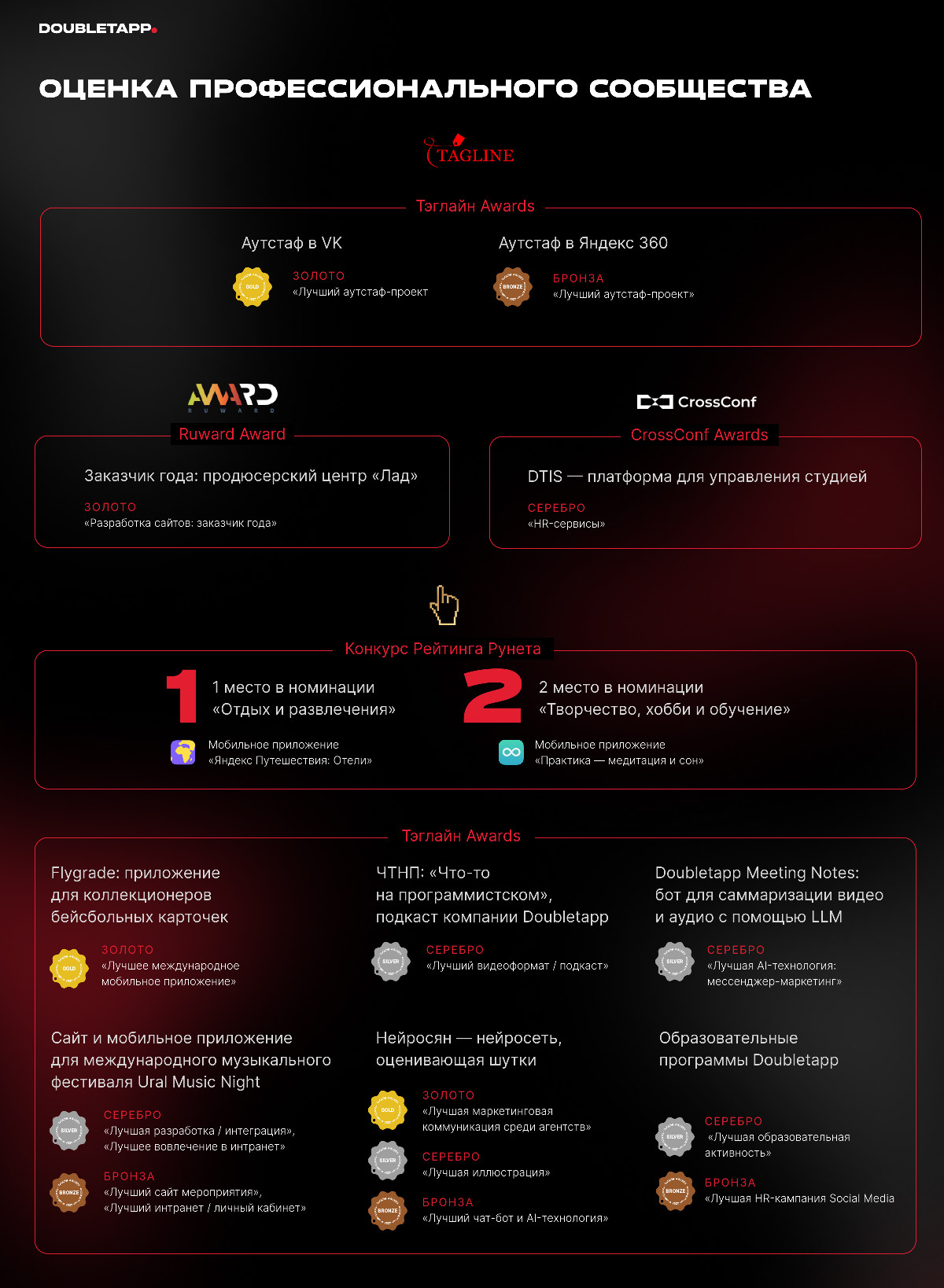 Конкурсная номинация — это возможность отметить не только отдельные успешные кейсы, но и компании, меняющие правила игры. Doubletapp — именно такая компания.