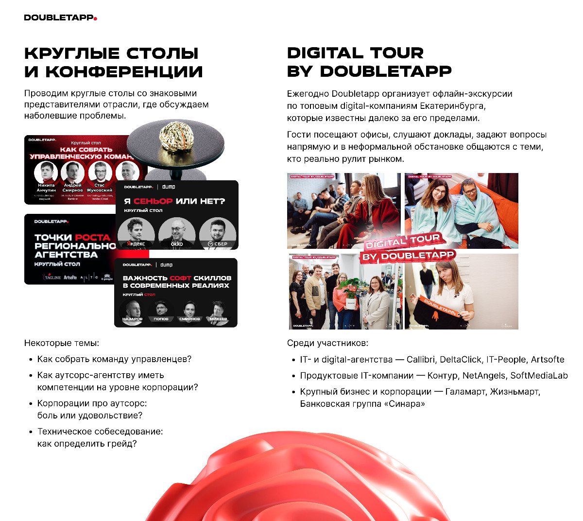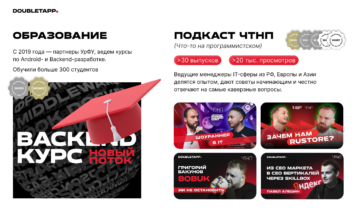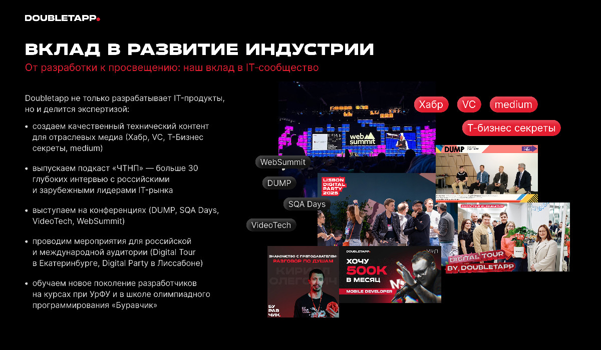 Doubletapp формирует отраслевой кадровый резерв, развивает открытые каналы обмена знаниями и способствует выстраиванию эффективных форматов взаимодействия между агентствами и корпорациями.