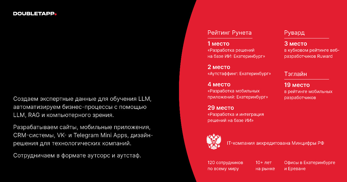 Компания основана в 2015 году и сегодня объединяет 120+ специалистов в распределённой команде с офисами в Екатеринбурге и Ереване. Doubletapp аккредитована Минцифры РФ.