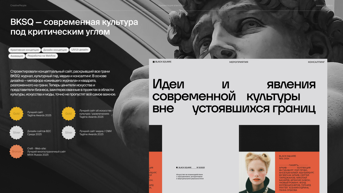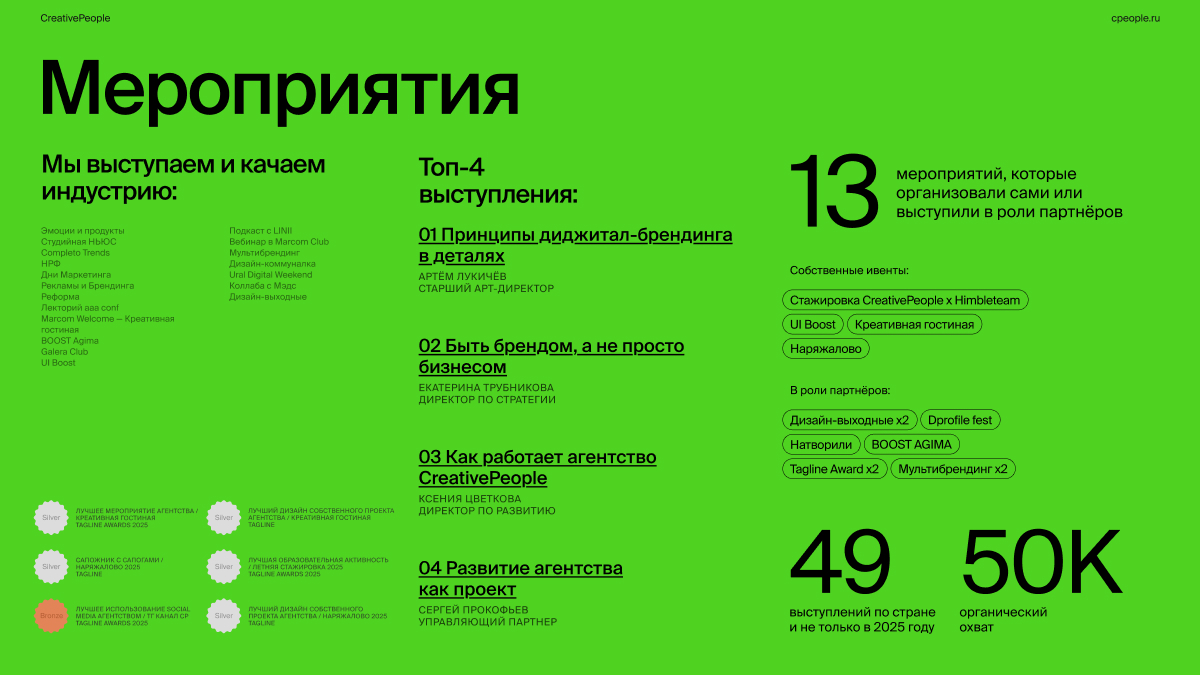 Зародившаяся в 2003 году компания как бизнес трёх студентов, которые начинали с небольших сайтов, сегодня CreativePeople — это известное на диджитал-рынке агентство, входящее в топ отраслевых рейтингов и ежегодно завоёвывающее десятки наград: в 2025 мы стали топ-1 креативным агентством и топ-2 дизайн-агентством и завоевали 49 наград.