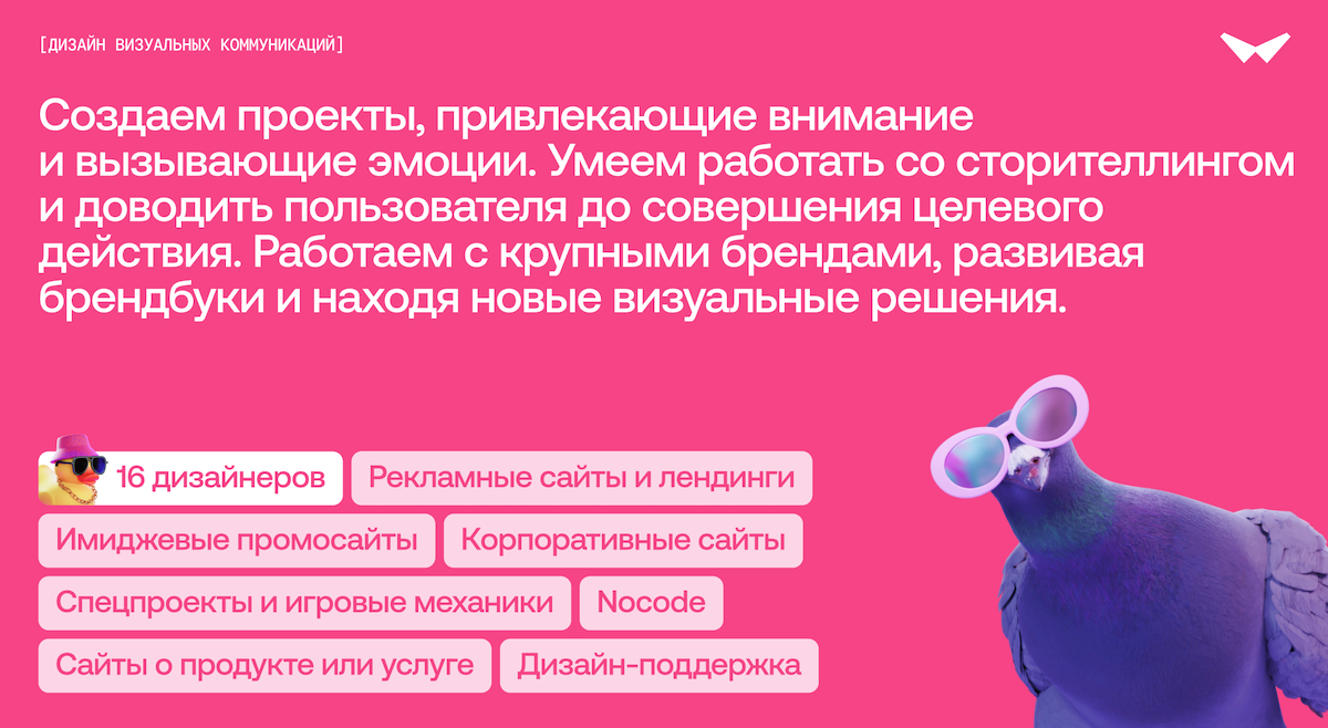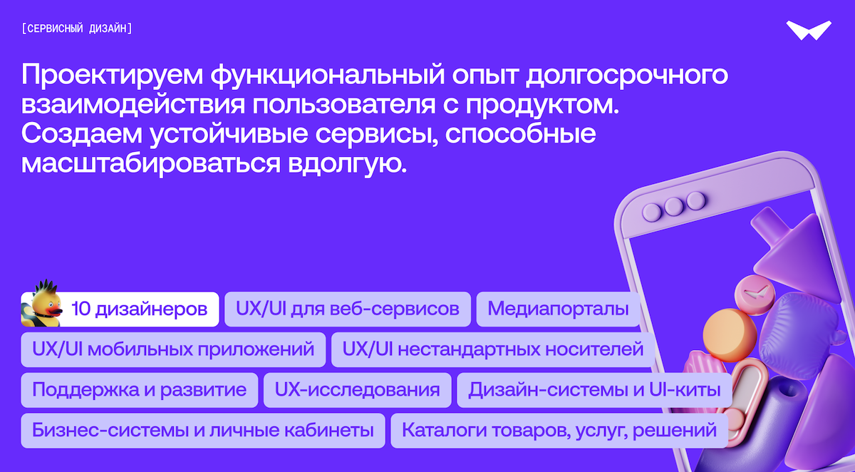 Закрываем все потребности заказчиков в дизайне — от исследования и поиска креативной концепции и упаковки бренда до разработки креативных спецпроектов и сложных сервисов, и дальнейшей дизайн-поддержки. Усиливаем хороший пользовательский опыт впечатляющими 3D и анимациями. Создаем брендинг и айдентику для стартапов, громких конференций и крупных HR-брендов