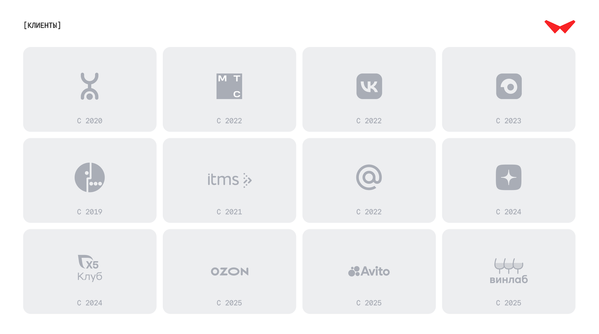 Строим долгосрочные отношения, на сегодня средний срок работы с ключевыми клиентами превысил три года. Уже несколько лет создаем и запускаем проекты для МТС, VK/Mail, Dzen, Яндекс, МегаФон, Yota, X5 Group, ITMS и других крупных компаний. В 2025 году пополнили клиентский портфель проектами для Ozon, Винлаб и Авито