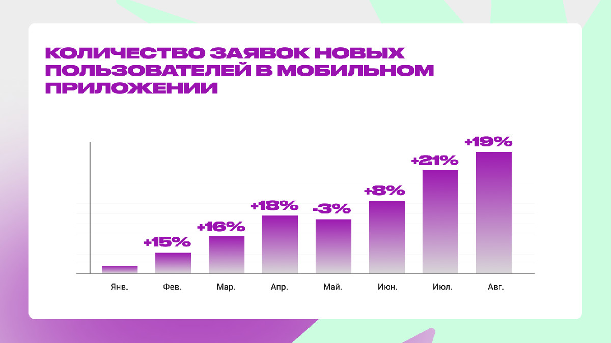 - Обеспечили ежемесячный стабильный рост — целевого события, отражающего реальные заявки новых пользователей в приложении
