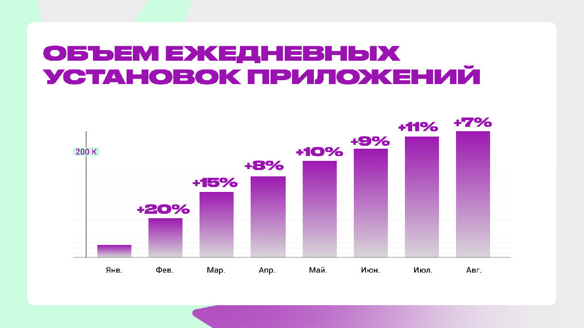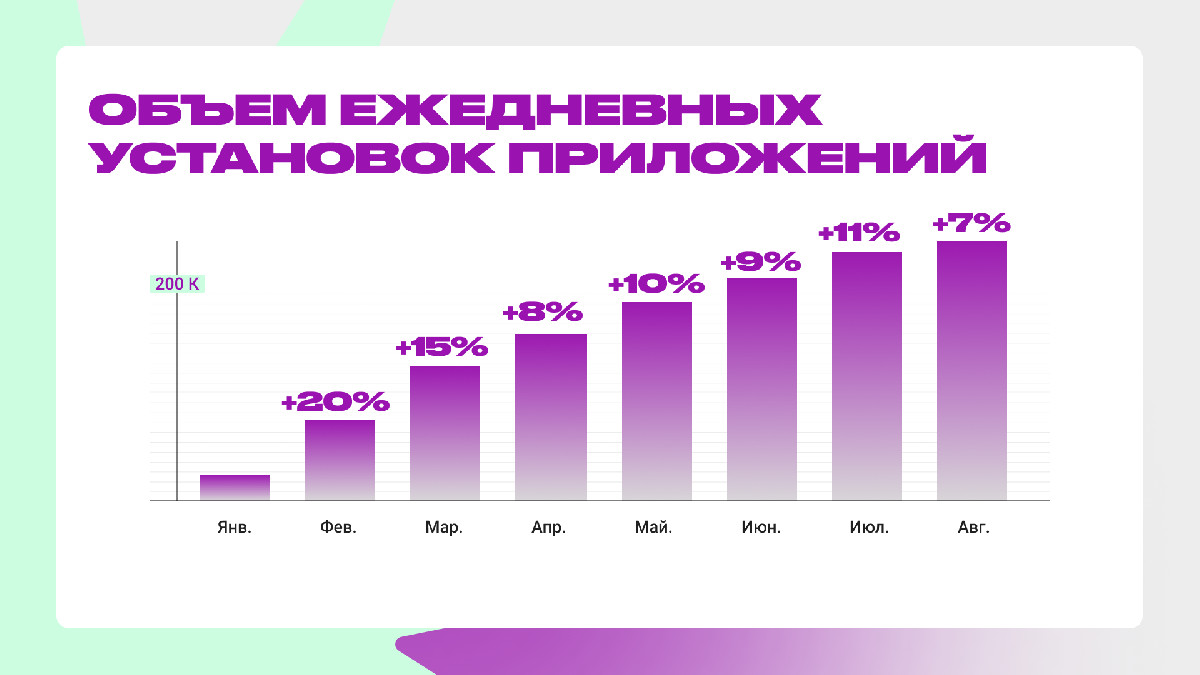 - Увеличили ежемесячный объем установок более чем в 2 раза без потери контроля качества трафика