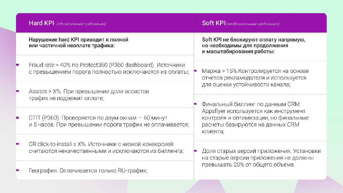 - Нарушение hard KPI приводит к полной или частичной неоплате трафика: