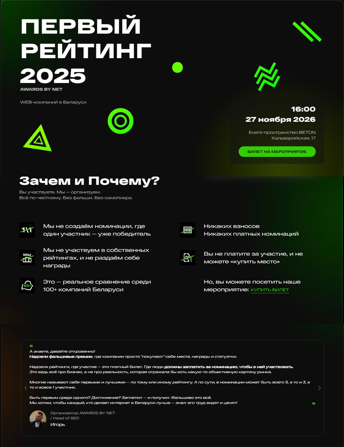 - В октябре 2025 года наше агентство стало соорганизатором SEO конференции в Минске, где совместными усилиями удалось собрать больше 250 человек, что для белорусского SEO-сообщества было впервые за последние 5 лет!