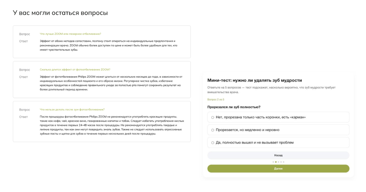 Мы создали чёткие, структурированные ответы на популярные вопросы пациентов, добавили логические блоки с заголовками и подзаголовками, внедрили прямые ответы в формате «вопрос-ответ» на страницах услуг.