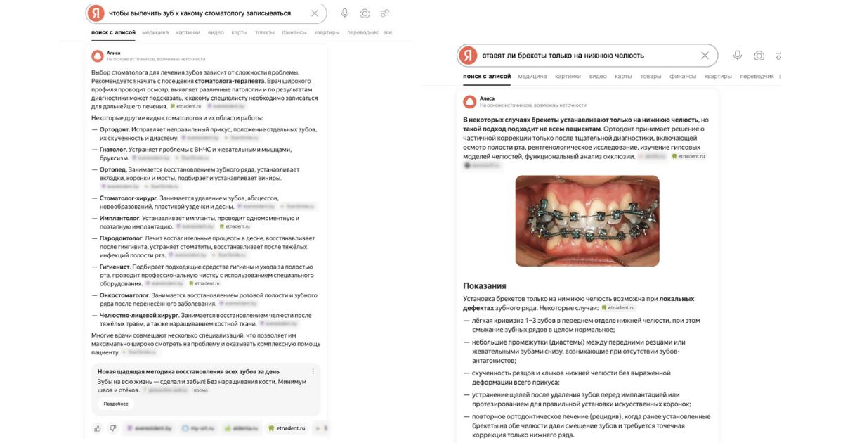 Особое внимание уделили терминологии. ИИ обучается на множестве источников, поэтому важно было использовать те же формулировки и определения, которые встречаются в медицинской литературе и авторитетных источниках. Подготовили контент по темам: «Ставят ли брекеты только на нижнюю челюсть?», «Фотоотбеливание в Москве: цены и процедура», «Имплантация Medentika: цена и особенности», «Как чистить зубы после удаления зуба?» и многим другим востребованным запросам.