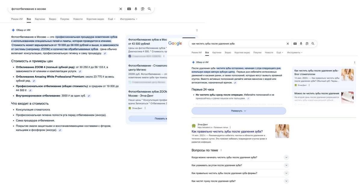 ИИ-системы обучаются на данных из всего интернета, а не только с одного сайта. Поэтому мы работали над созданием упоминаний клиники на различных авторитетных ресурсах. Прямые упоминания в медицинских справочниках, контекстные упоминания в профильных статьях, экспертные комментарии специалистов клиники на тематических площадках — всё это формирует образ Этна-Дент как авторитетного источника информации в глазах искусственного интеллекта.