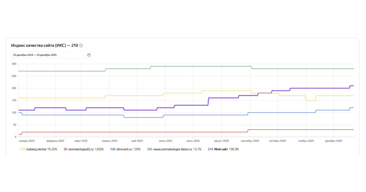 Индекс качества сайта (ИКС) в Яндексе вырос почти в 2 раза — с 110 до 210 баллов за период с декабря 2024 по декабрь 2025. Это прямое подтверждение того, что поисковые системы и ИИ-ассистенты признали сайт авторитетным источником информации в области стоматологии.