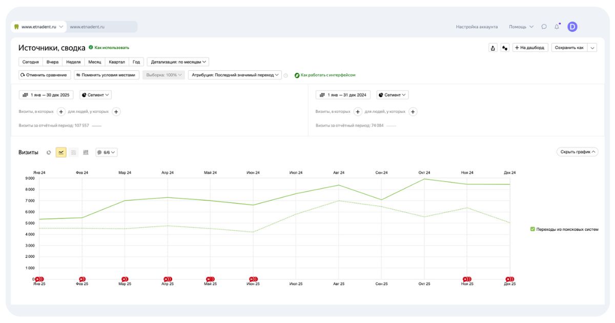 Динамика визитов наглядно демонстрирует устойчивый рост трафика из новых каналов. На графике видно появление и укрепление трёх ключевых источников: alice.yandex.ru (красная линия), chatgpt.com (голубая линия) и perplexity.ai (розовая линия). Общий объём визитов вырос с 74 084 (январь-декабрь 2024) до 107 541 (январь-декабрь 2025), что демонстрирует стабильную положительную динамику.