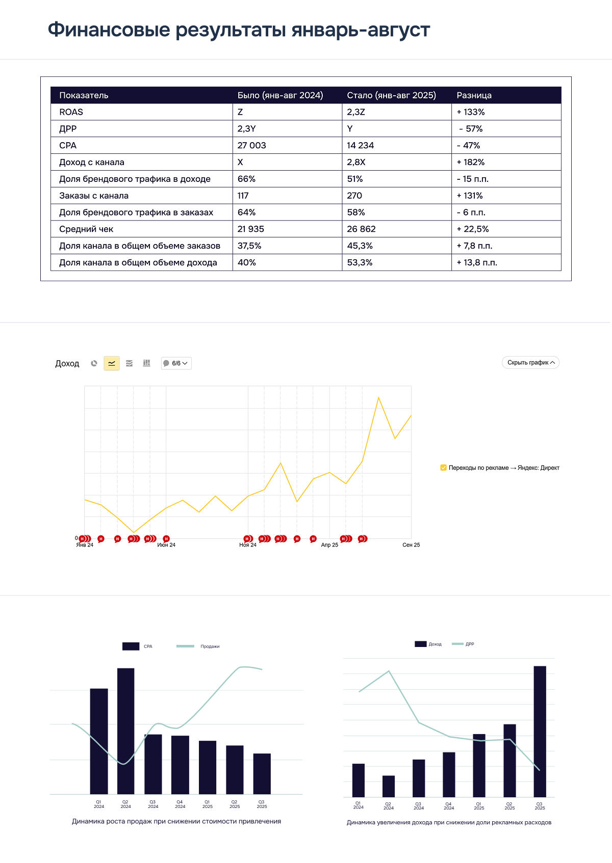 - Показатель ROAS увеличился на 133%, а ДРР сократился на 57%.