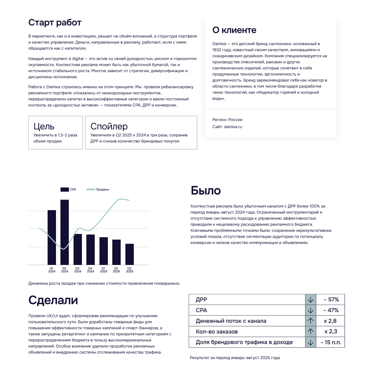 Проект Damixa подтверждает, что последовательная оптимизация всех уровней воронки позволяет достигать роста продаж при сохранении целевых показателей рентабельности.