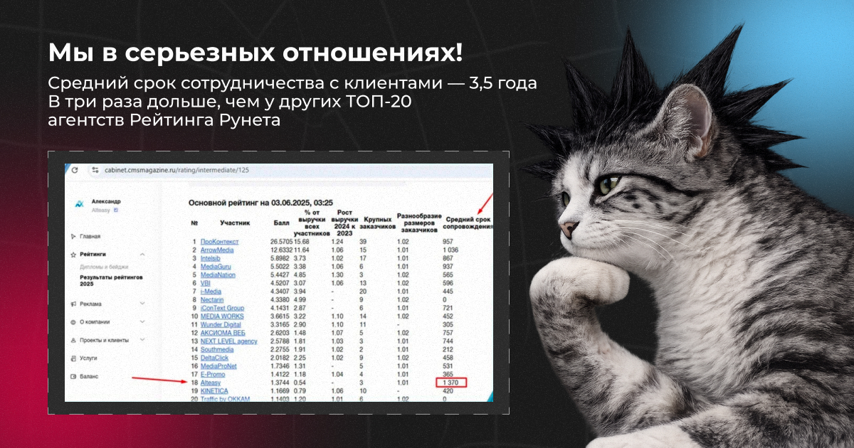 С Alteasy клиенты работают в среднем 3,5 года.Это в три раза дольше, чем у других агентств из ТОП -20 Рейтинга Рунета