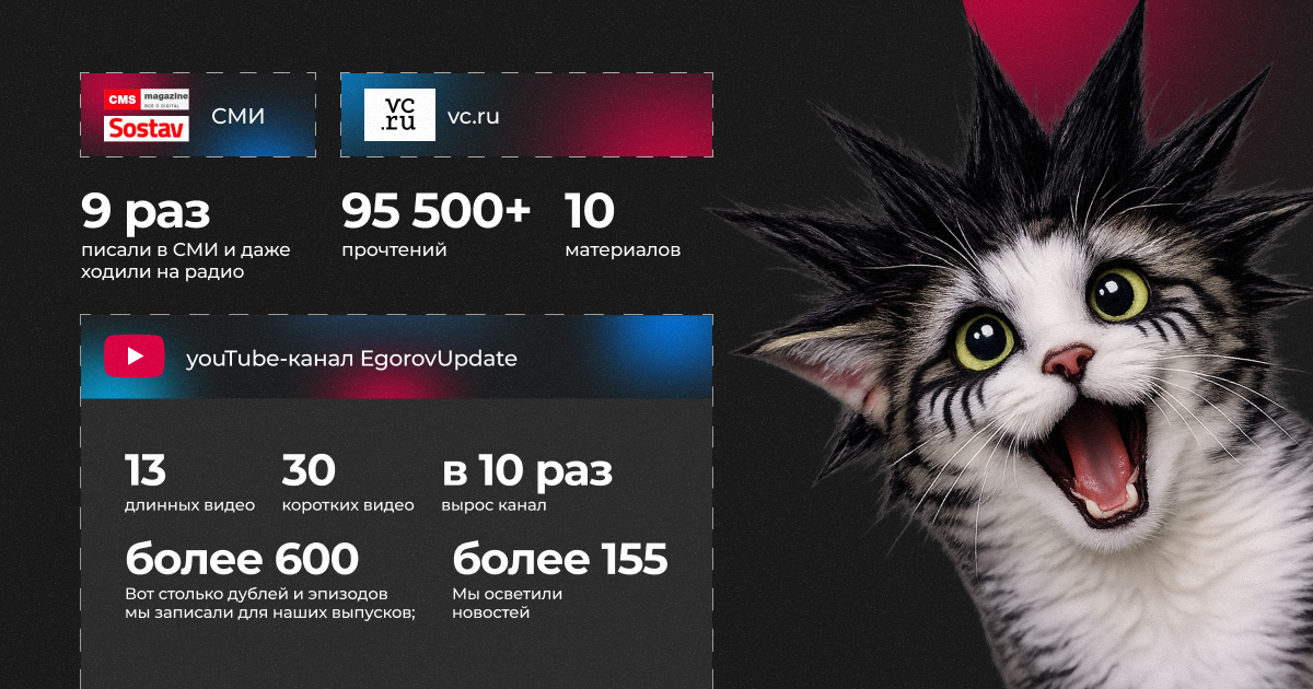 У нас есть некоммерческий youTube-канал EgorovUpdate про digital-маркетинг и индустрию в целом. Мы обсуждаем самые важные новости рынка, даем свою оценку, обсуждаем спорные вопросы в комментариях.