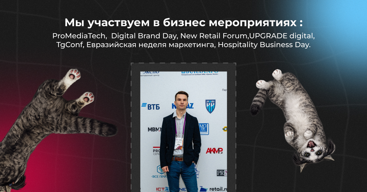 Мы участвуем в крупнейших отраслевых мероприятиях и бизнес мероприятиях: Ecom, Поток, ProMediaTech, Digital Brand Day, New Retail Forum,UPGRADE digital, TgConf, Евразийская неделя маркетинга, Hospitality Business Day, Optimization, E-target.