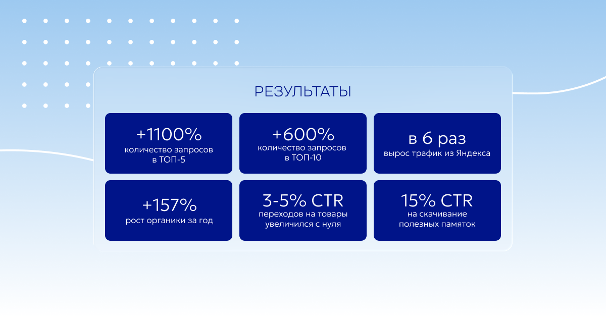 - Кол-во запросов в ТОП-5 выросло в 12 раз (+ 1100%).