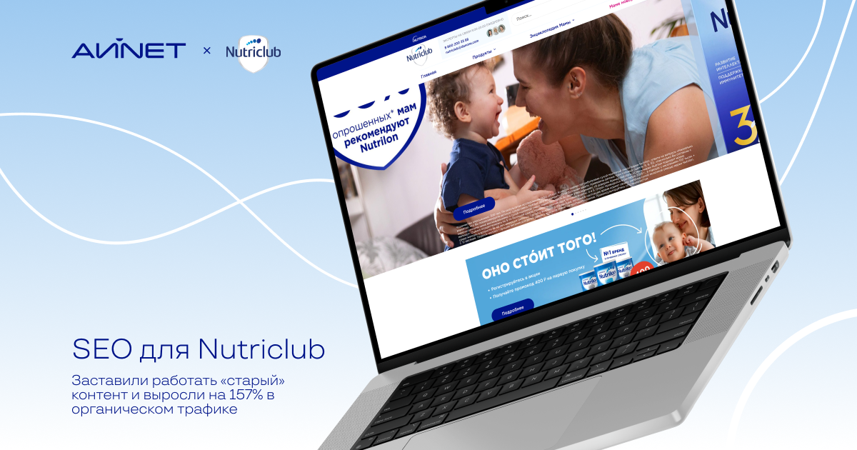 Nutriclub — это информационно-образовательный ресурс компании «Нутриция», посвященный экспертной поддержке молодых родителей и беременных женщин. Проект с многолетней историей и не самой простой SEO-судьбой, который к моменту нашего прихода не входил в ТОП при поисковом запросе.