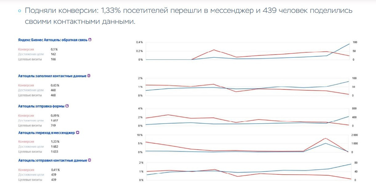 Устойчивый рост количества входящих обращений из поиска, что сопровождалось повышением качества лидов. Подняли конверсии: 1,33% посетителей перешли в мессенджер и 439 человек поделились своими контактными данными.