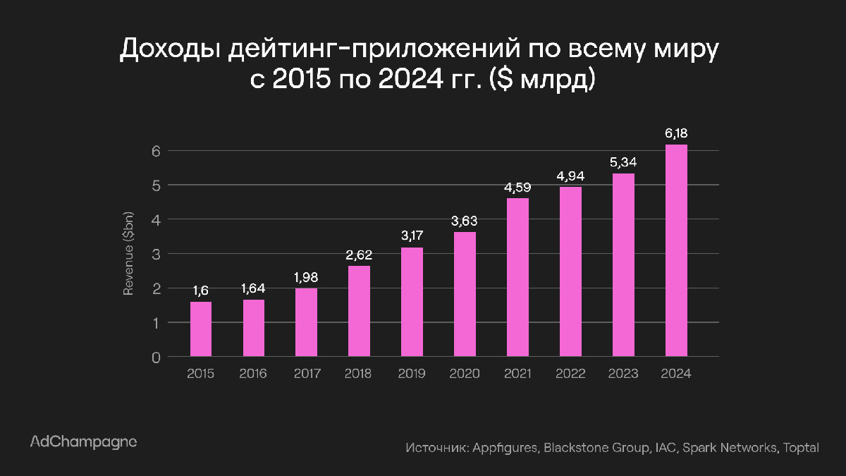 Эти задачи формировались в контексте динамики рынка: только в 2024 году мировая выручка дейтинг-приложений достигла $6,18 млрд, при более чем 350 млн пользователей, из которых 25 млн регулярно пользуются платными сервисами.