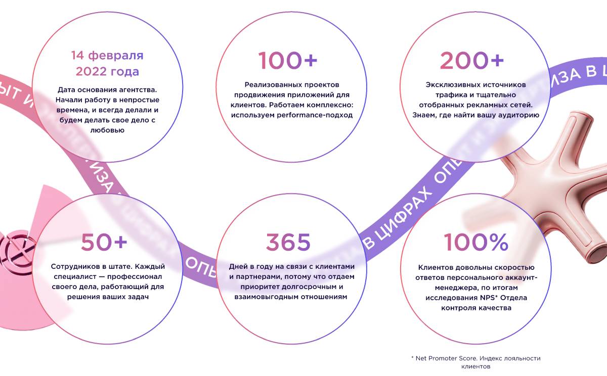 - 100+ реализованных проектов продвижения приложений для клиентов. Работаем комплексно, используем performance-подход.