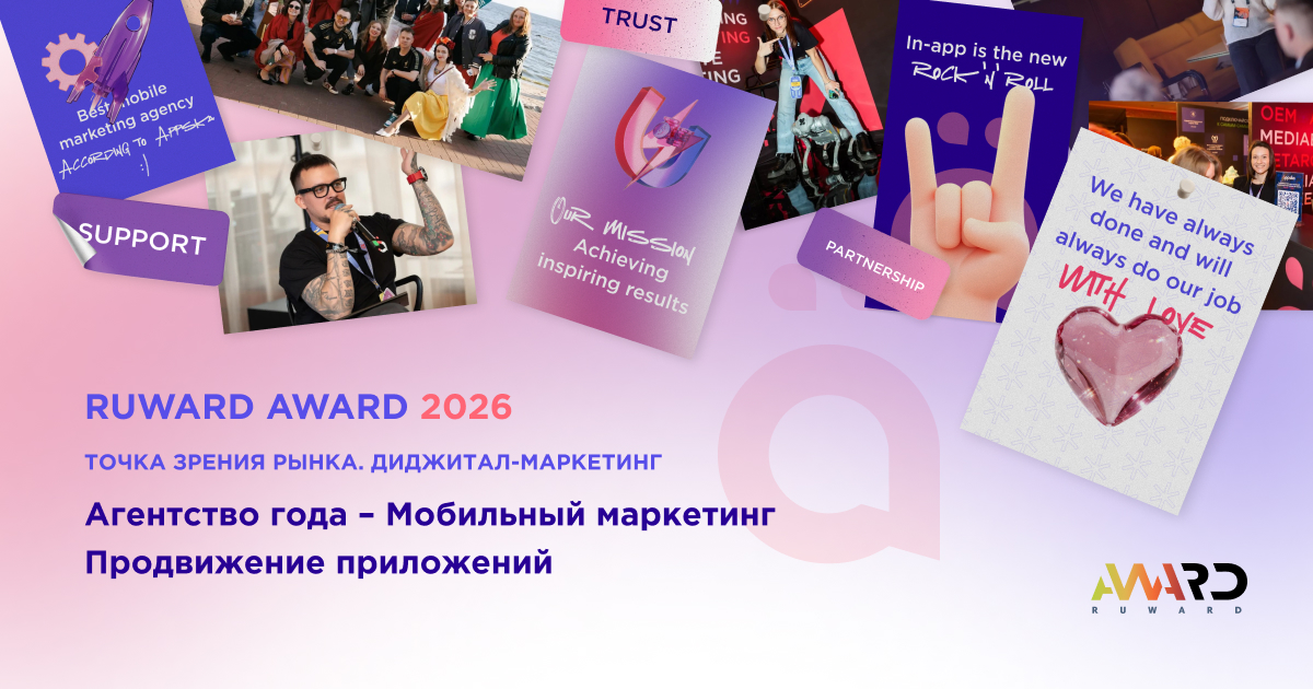 - Рейтинг Рунета 2025 — впервые подавались на рейтинг, сразу попали в Топ-10 подрядчиков по мобильному маркетингу в общем зачете и заняли лидерские позиции в отдельных категориях.