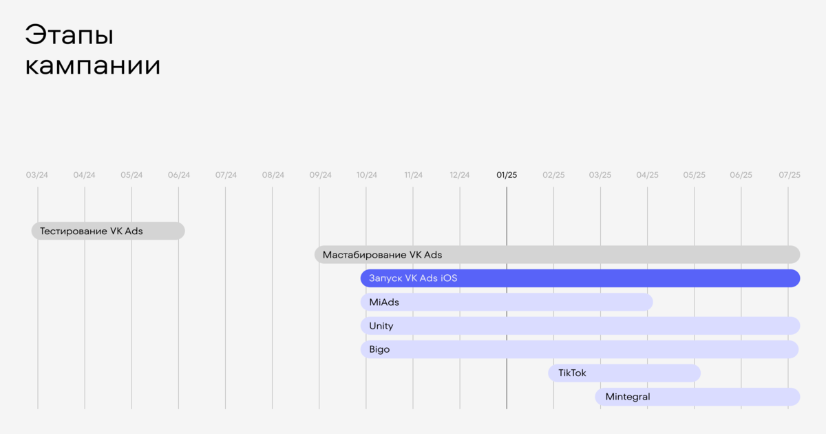 В начале 2024 года мы запустили тесты в VK Клипах. Для нас это проверенный источник вертикальных видео с нулевым уровнем фрода и самой большой аудиторией в России (58,6 млн MAU, 2,7 млрд просмотров в сутки, источник: VK).