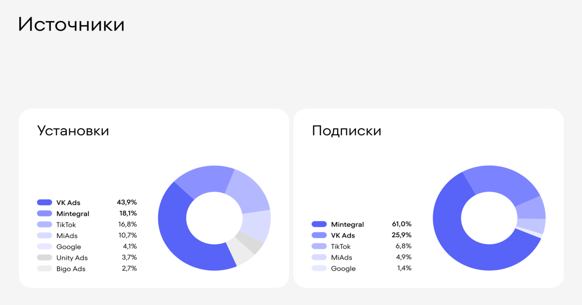 VK Ads стал основной площадкой и привёл больше всего установок. Лучший результат по конверсии дал in-app источник Mintegral за счёт сложной ручной оптимизации кампании и нулевого фрода. При масштабировании источник принёс сервису 61% платных подписчиков от всего объёма рекламных конверсий.