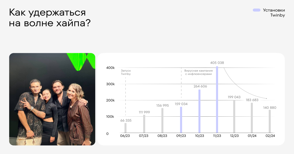 На старте проект получил мощный стимул к масштабированию благодаря вирусной кампании с крупными инфлюенсерами, которая принесла 244 тыс. установок. Но эффект оказался краткосрочным: после спада медийной активности органический рост замедлился. Проекту требовался переход от ситуативных всплесков к управляемой и прогнозируемой модели роста.