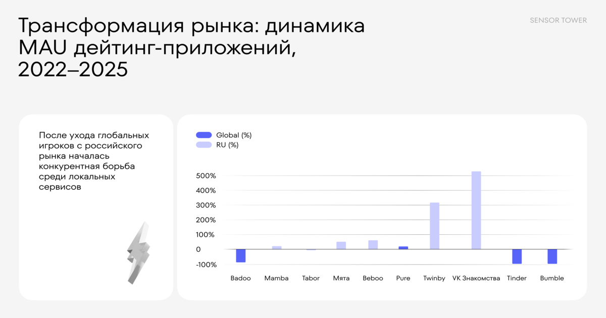Twinby — дейтинг-сервис для поиска серьезных отношений, где пары подбираются на основе тестов на психологическую совместимость. Приложение запустилось в момент трансформации российского рынка: после ухода западных гигантов (Tinder, Badoo и других) началась жесткая конкуренция локальных игроков за освободившуюся аудиторию.