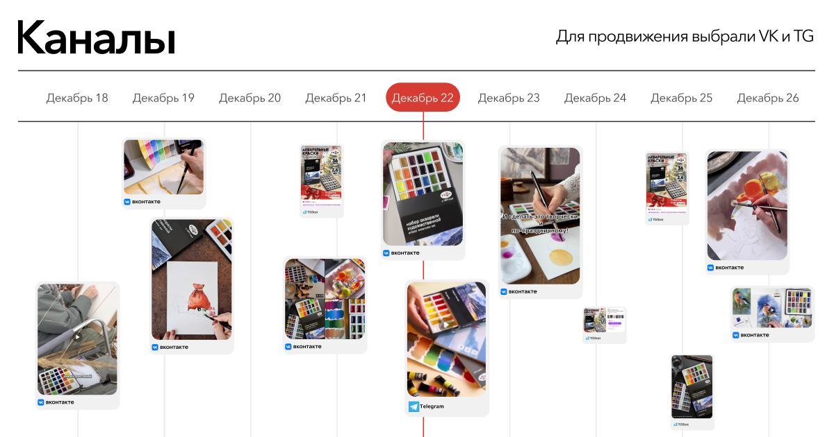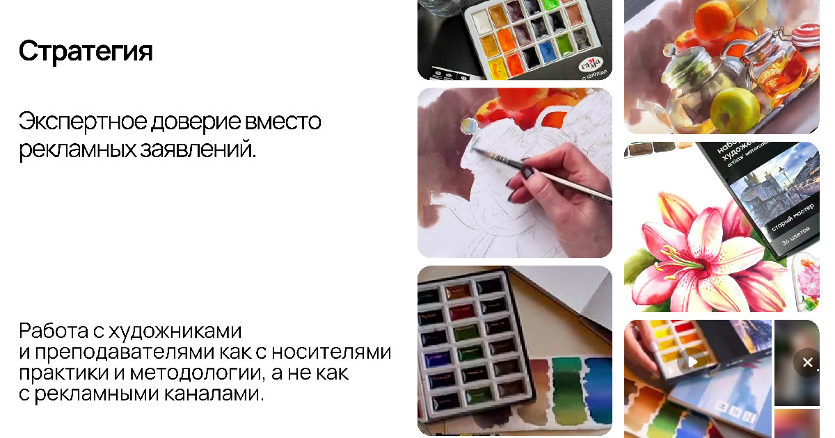 Вместо размещения отдельных рекламных интеграций мы выстроили систему сотрудничества с художниками и арт-преподавателями, регулярно создающими обучающий контент. Они выступали не рекламными носителями, а проводниками практического опыта использования материалов.