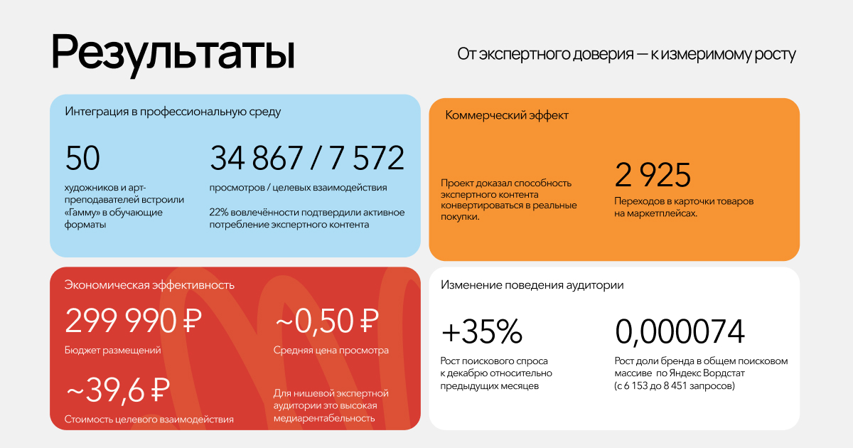 Проект был направлен на изменение восприятия линейки художественных материалов «Гамма» и интеграцию бренда в профессиональную и образовательную среду художников. Результаты кампании оцениваются по трём ключевым направлениям: охват и вовлечённость аудитории, изменение потребительского поведения и бизнес-эффект.