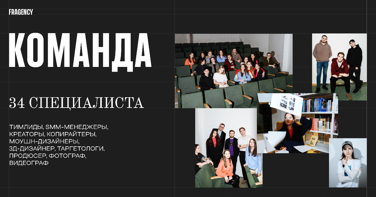 Команда: 34 человека. Эксперты в SMM, креативе, спецпроектах и продвижении. У каждого из нас большой опыт и экспертиза в своей нише.