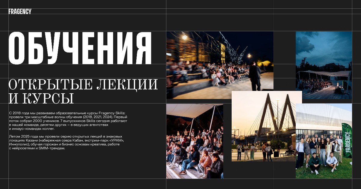 Мы верим, что качество рынка зависит от качества кадров. С 2018 года мы развиваем образовательные курсы Fragency Skills: провели три масштабные волны обучения (2018, 2021, 2024). Первый поток собрал 2000 учеников. 7 выпускников Skills сегодня работают в нашей команде, десятки других – в ведущих агентствах и инхаус-командах коллег.