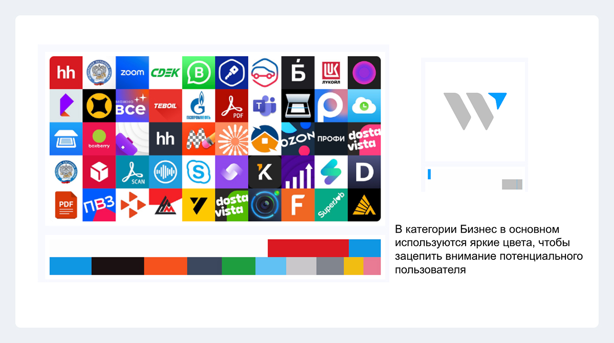 Кусочек сбора референсов во время исследования цветовой гаммы иконок в категории «Бизнес», в которой двигается клиент, для поиска тенденций и закономерностей.