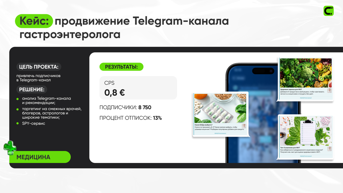 Работа с медицинским и фармацевтическим сегментом требует особого сочетания точности, ответственности и креативного подхода. Мы строим стратегии продвижения так, чтобы бренды могли говорить с аудиторией корректно, этично и эффективно, используя весь потенциал digital-платформ, включая Telegram.