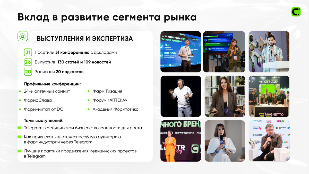 На этих площадках команда делилась практическими кейсами и аналитикой использования Telegram в фармацевтическом маркетинге.