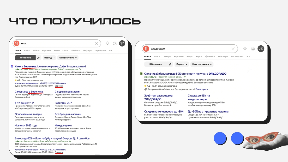 - Конверсия в покупку ниже. Чем выше цена товара, тем больше у клиента сомнений. Ему гораздо проще купить дорогой товар, зная, что есть куда обратиться с проблемой при необходимости. А когда человек не видит ПВЗ или шоурума в своём городе, он может отказаться от покупки ещё на этапе поиска. Чтобы снять эти барьеры, мы добавляем в объявления упоминания: «ПВЗ по адресу: г. Курск, ул. Радищева, д. 110» или «Доставка в Липецке». Такие фразы успокаивают и снимают часть вопросов заранее.