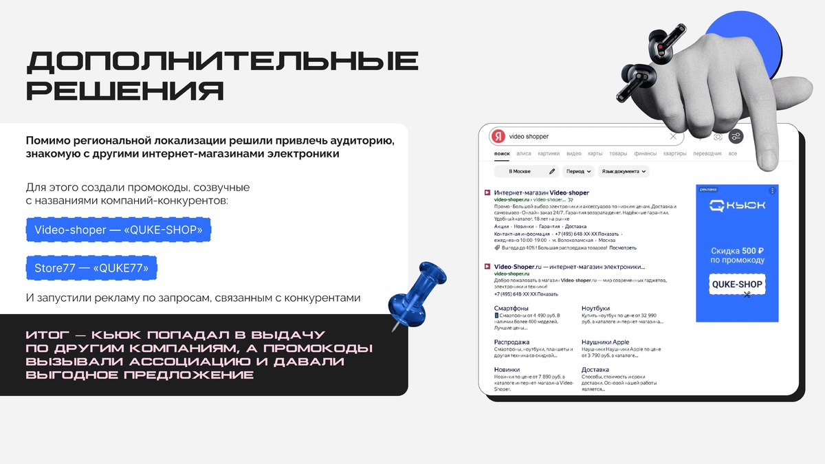 И запустили рекламу по запросам, связанным с конкурентами. Таким образом Кьюк попадал в выдачу по другим компаниям, а промокоды вызывали ассоциацию и давали выгодное предложение.