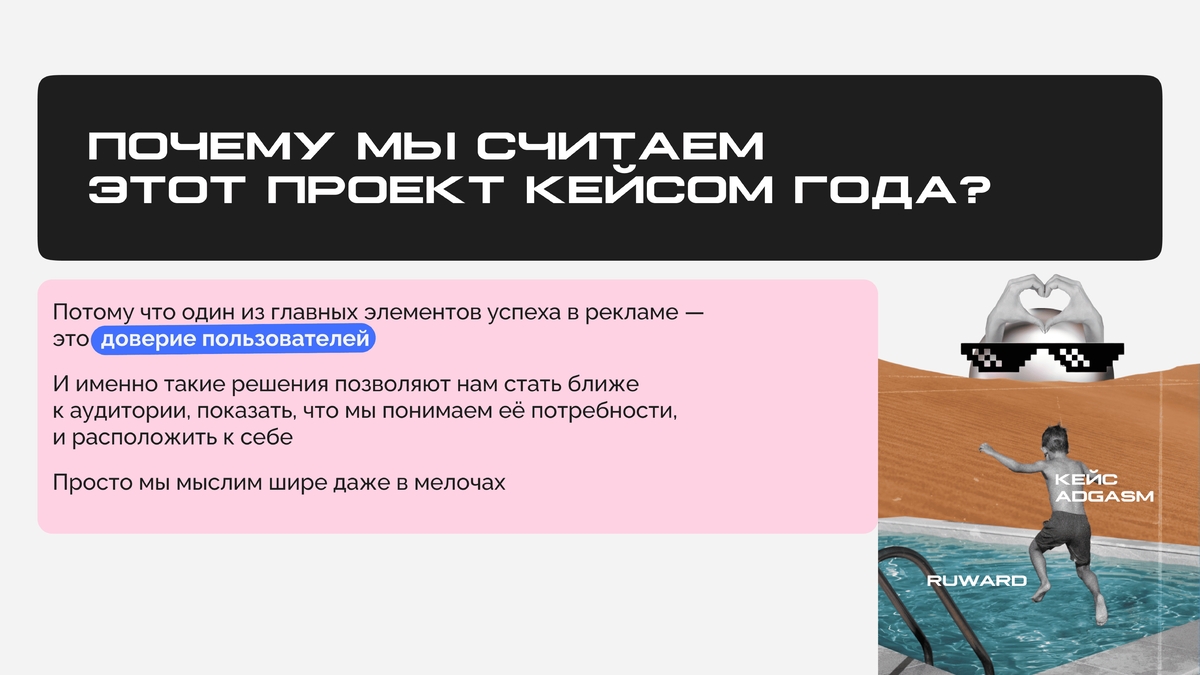 Потому что один из главных элементов успеха в рекламе — это доверие пользователей. И именно такие решения позволяют нам стать ближе к аудитории, показать, что мы понимаем её потребности, и расположить к себе.